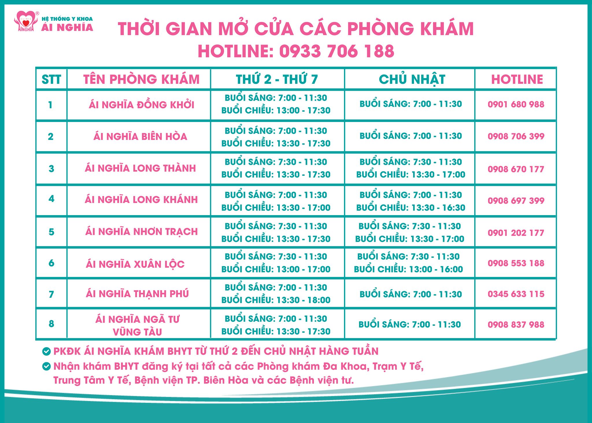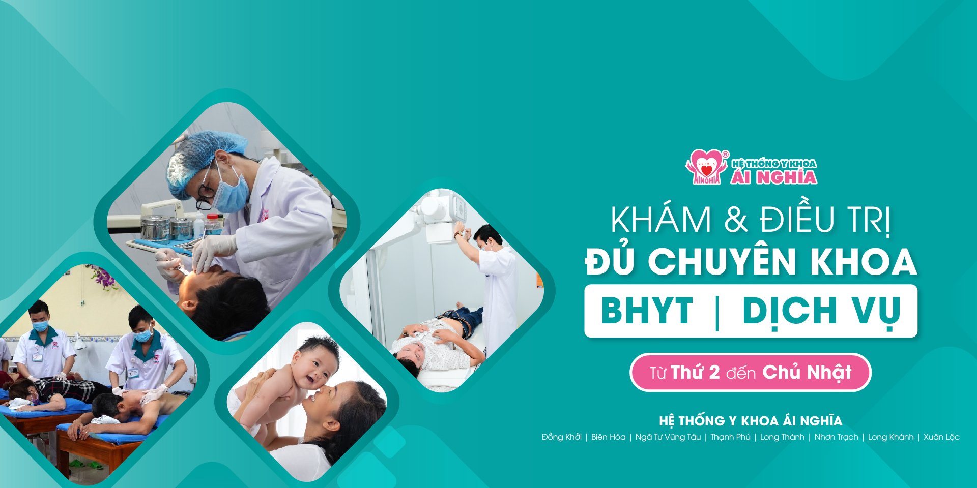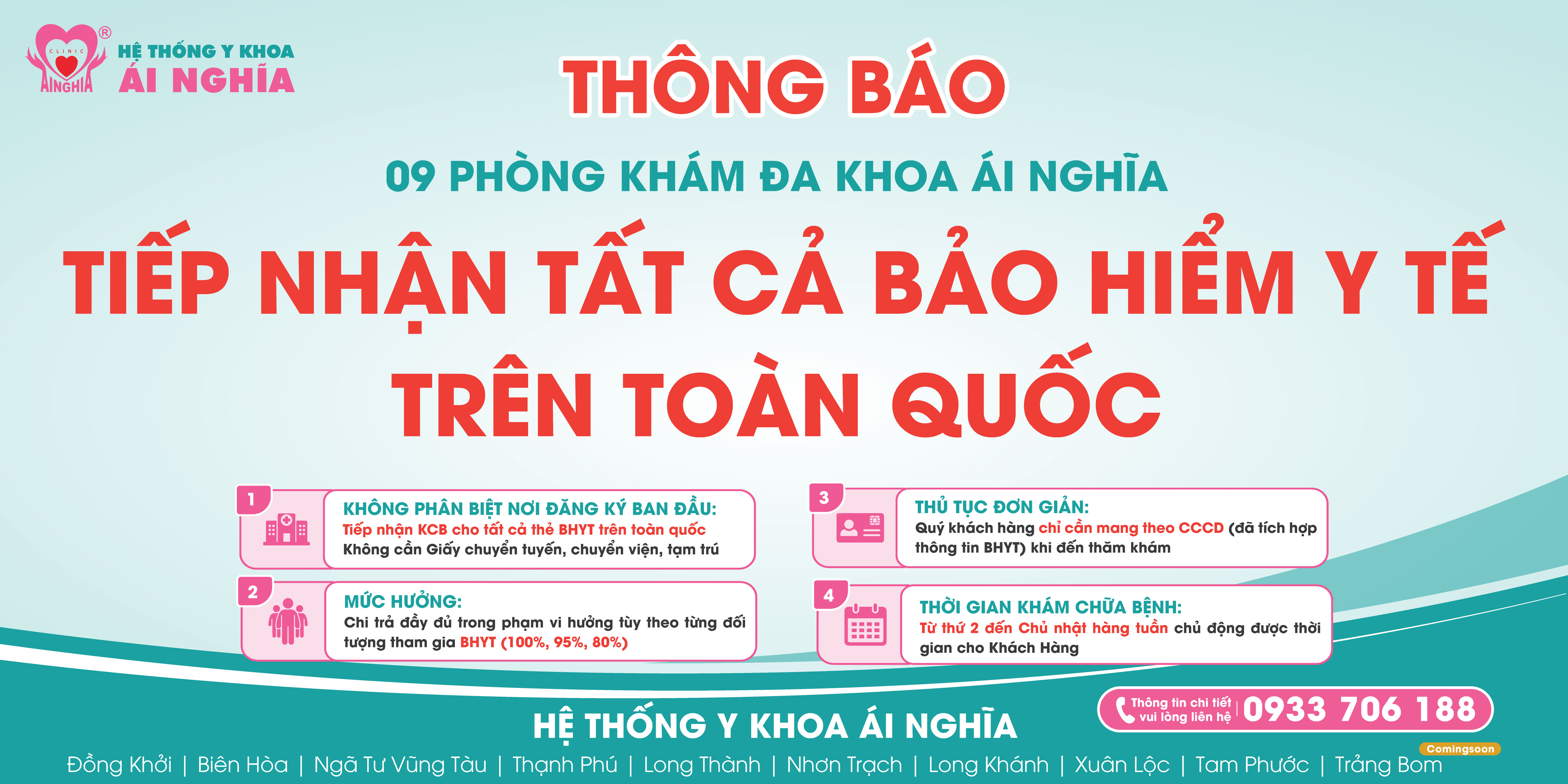 Hệ thống Y khoa Ái Nghĩa với 8 phòng khám đa khoa từ Biên Hòa đến Xuân Lộc đều: Tiếp nhận khám BHYT tất cả các chuyên khoa TỪ THỨ 2 ĐẾN CHỦ NHẬT HÀNG TUẦN!