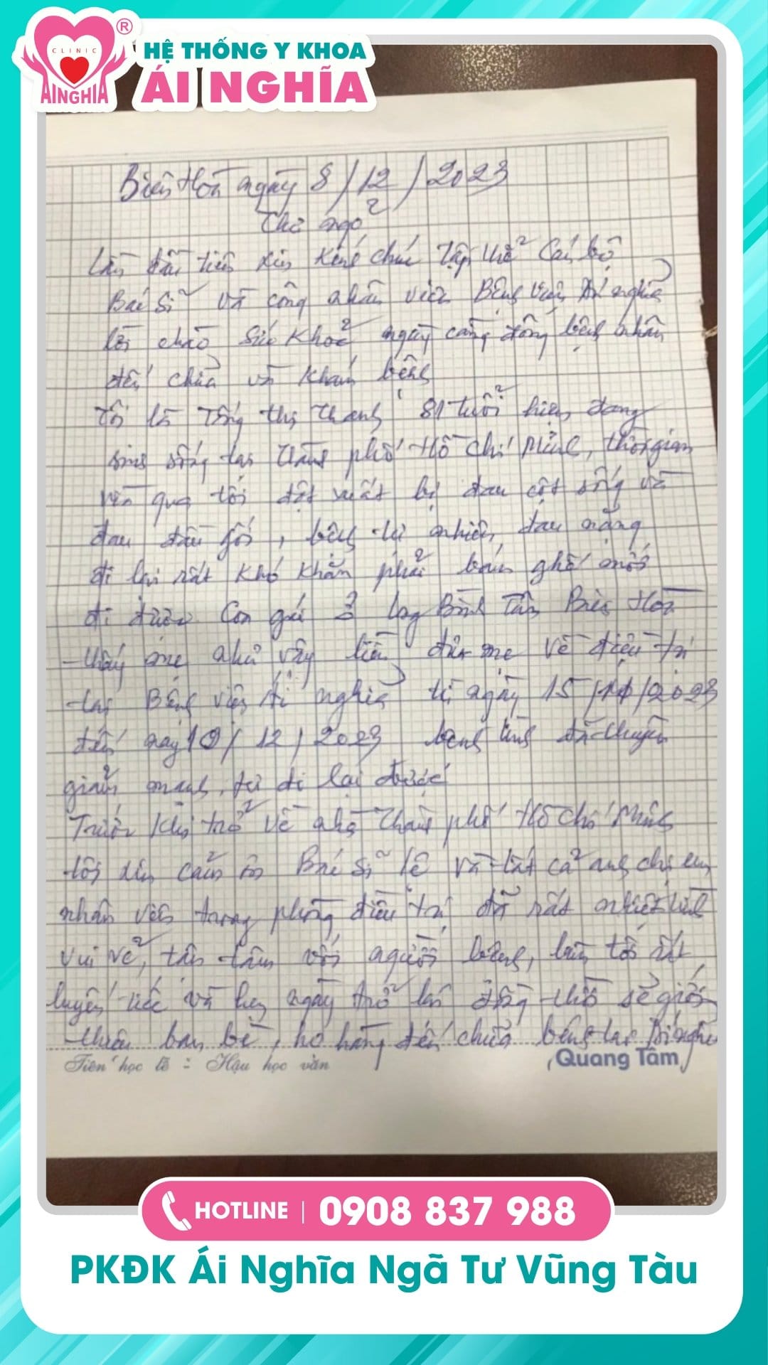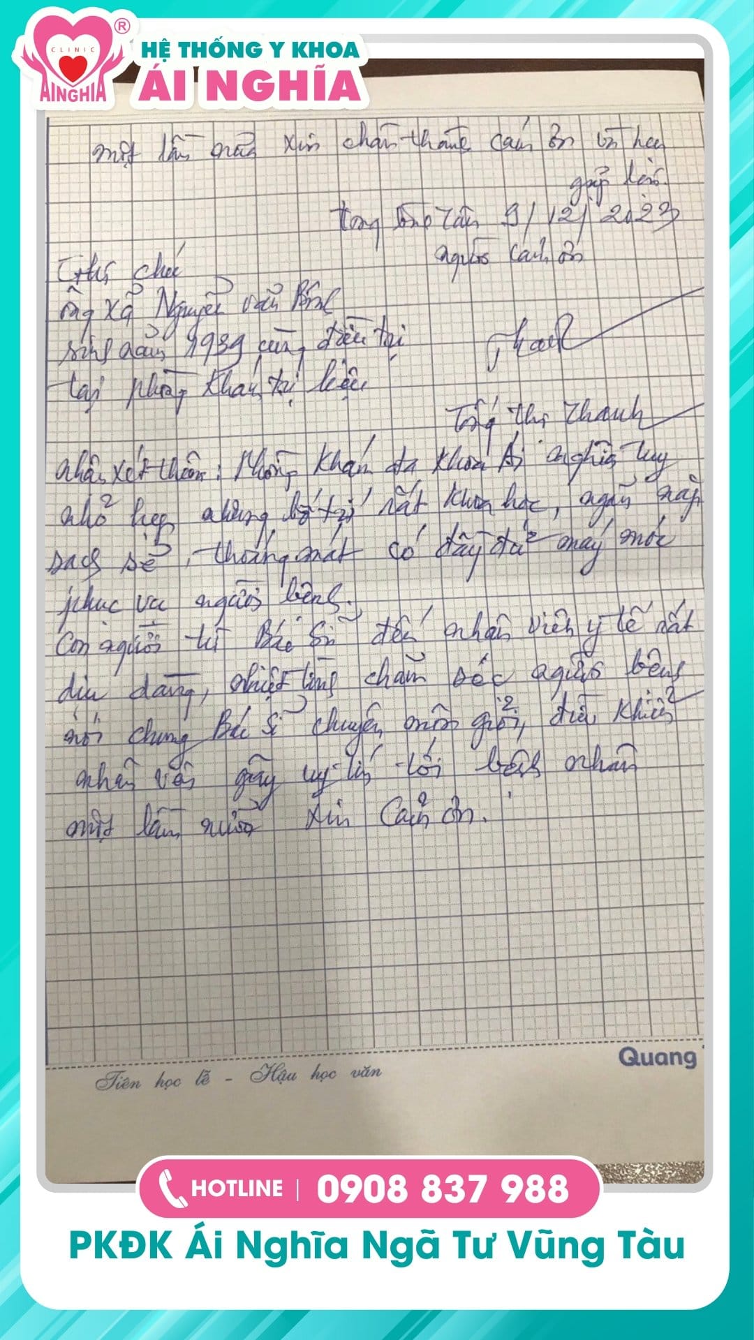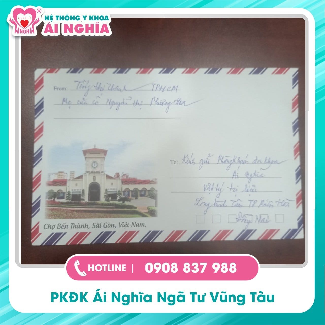 Xin chân thành cám ơn Khách hàng Tống Thị Thanh (mẹ cô Nguyễn Thị Phương Hoa) luôn tin tưởng sử dụng dịch vụ tại Ái Nghĩa Ngã Tư Vũng Tàu và những lời chia sẽ chân thành làm động lực đội ngũ CBCNV cố gắng và hoàn thiện mỗi ngày!