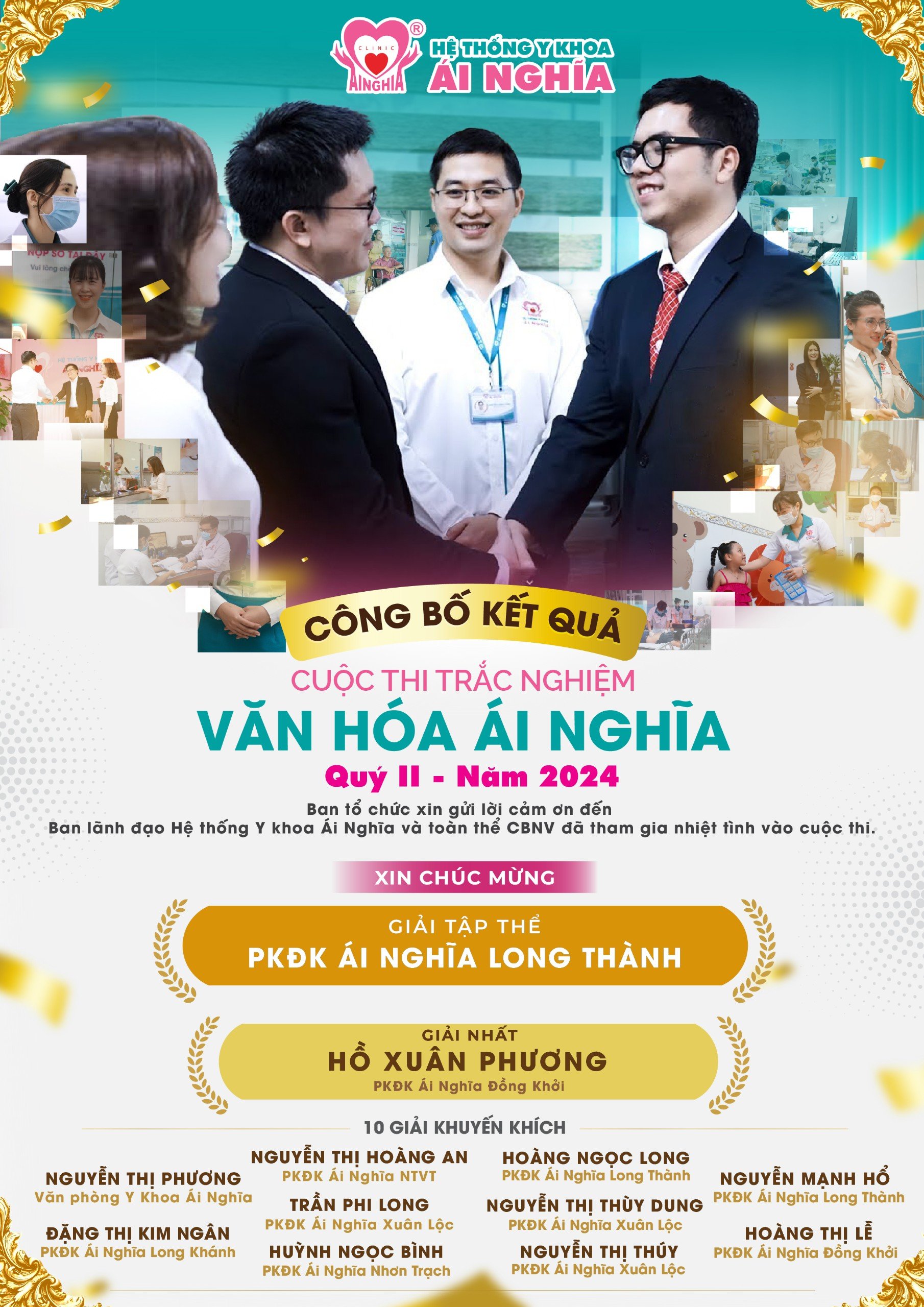 Tiếp nối thành công Hội thi văn hóa Ái Nghĩa Quý 1 năm 2024, hội thi thực sự mang đến không khí học tập, trao đổi và giao lưu giữa các thành viên trong đơn vị. Vào ngày 13/07 Hội thi văn hóa Ái Nghĩa Quý 2 năm 2024 tiếp tục triển khai trên toàn hệ thống với hình thức trắc nghiệm Online.