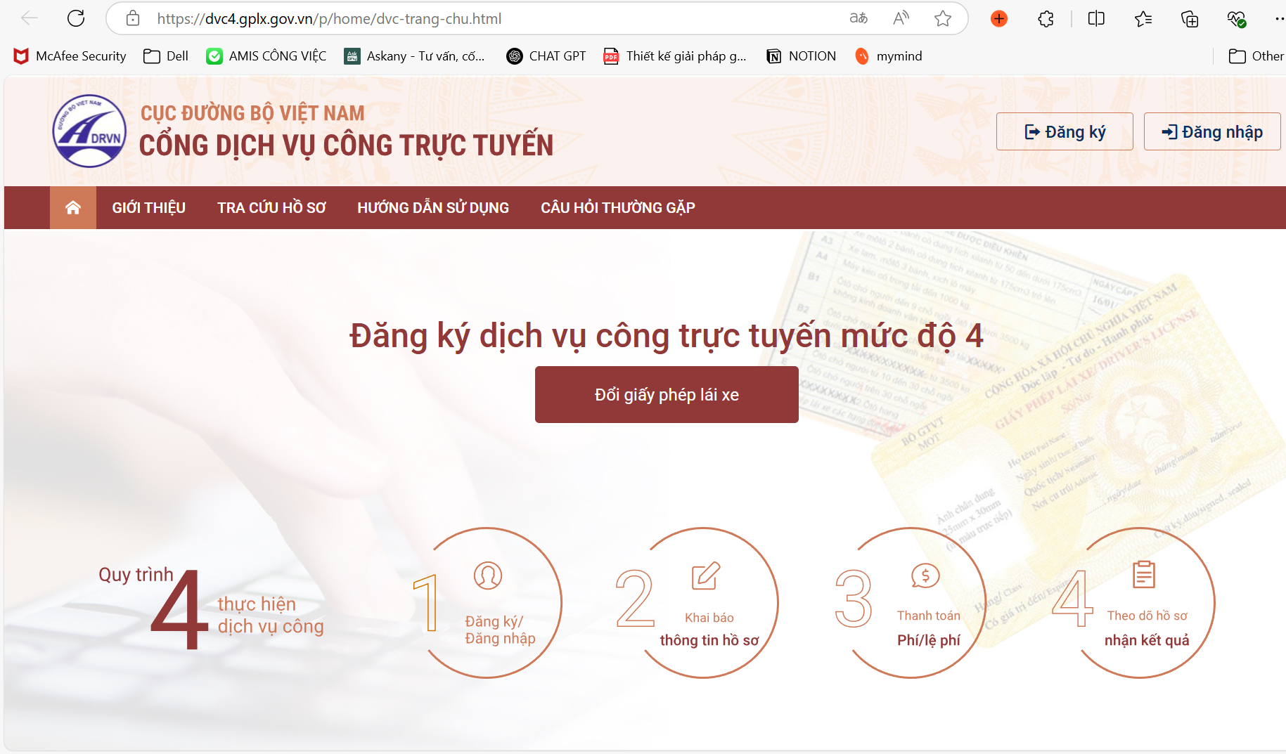 Bước 1: Truy cập vào Cổng dịch vụ công trực tuyến của Cục Đường bộ Việt Nam tại https://dvc4.gplx.gov.vn/p/home/dvc-trang-chu.html .