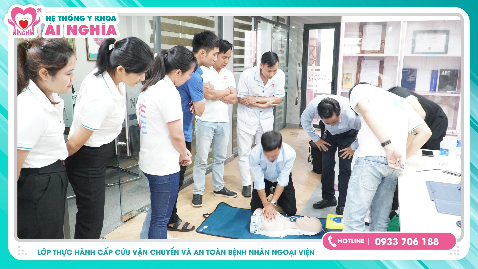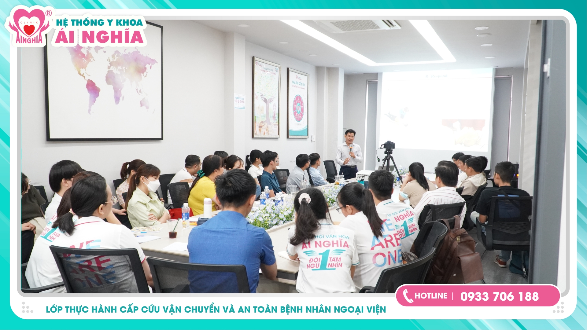 Buổi đào tạo có sự tham gia ThS BS Nguyễn Đình Trí - Phó Tổng giám đốc chuyên môn Hệ thống; ThS BS CKI Đỗ Ngọc Chánh - PGĐ Trung tâm Cấp cứu 115 và hơn 40 thành viên của 08 PKĐK Ái Nghĩa; Các chuyên gia cung cấp kiến thức và huấn luyện các nội dung Tiếp cận bệnh lý cấp cứu thường gặp theo Phác đồ DR-S-ABCDE; Quy trình báo động đỏ và kích hoạt hỗ trợ từ hệ thống mạng lưới cấp cứu lưu động và tấp huấn hồi sức tim phổi.