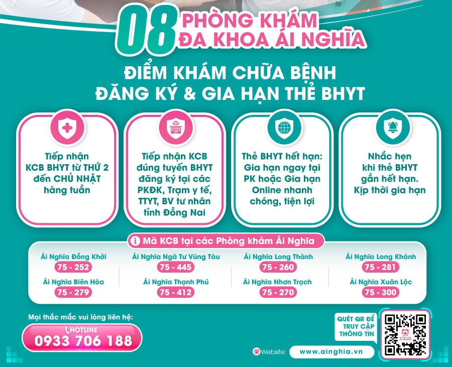 - 08 PKĐK Ái Nghĩa là Điểm bán và Gia hạn thẻ BHYT. Trong quá trình Khám chữa bệnh tại Phòng khám, khi thẻ BHYT hết hạn, quý Khách hàng được hướng dẫn Gia hạn ngay tại phòng khám hoặc Gia hạn Online nhanh chóng, tiện lợi.