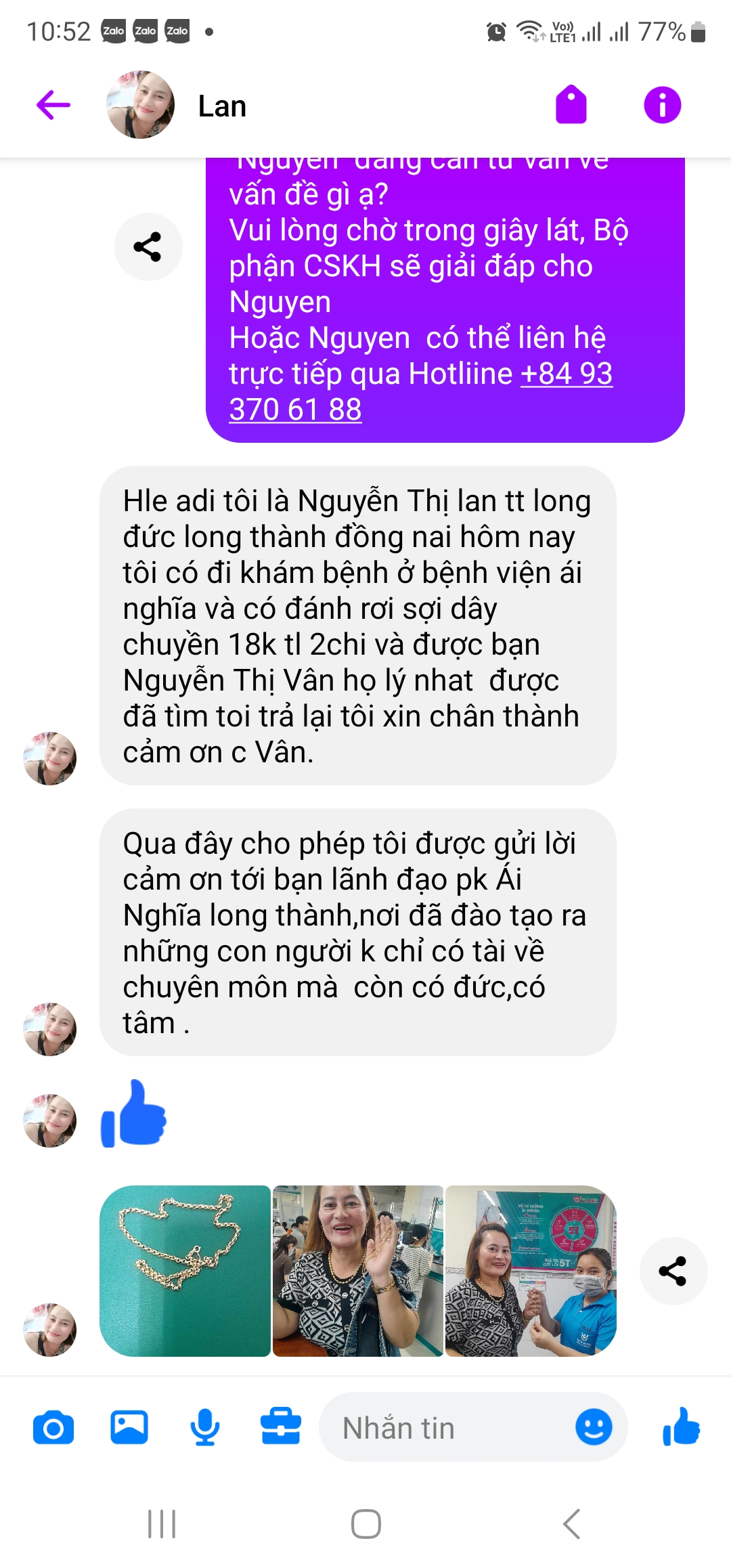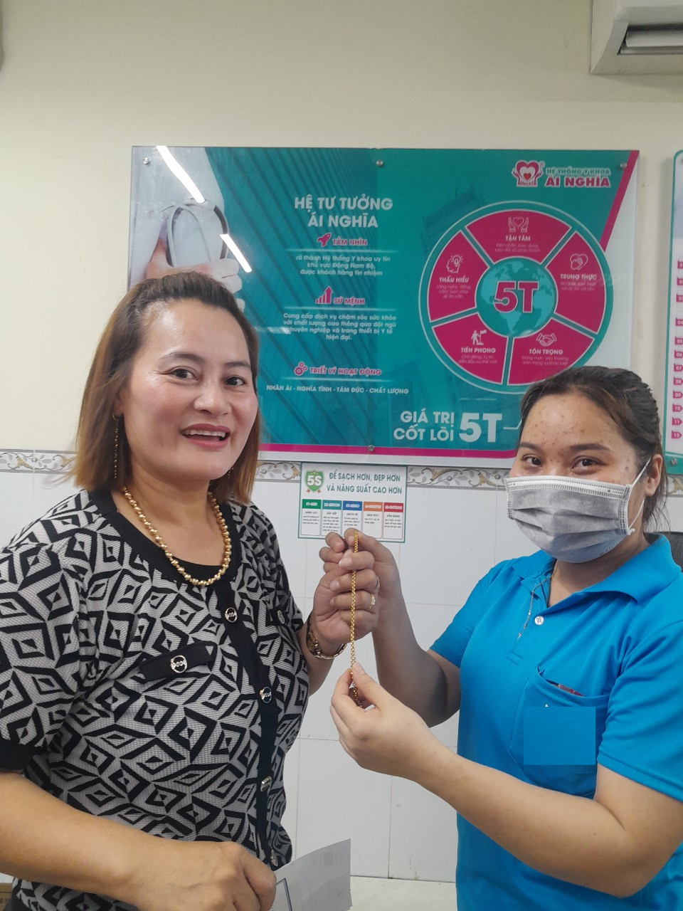 Sáng chủ nhật ngày 24/03 chị N.T.L đến thăm khám tại PKĐK Ái Nghĩa Long Thành. Khi thực hiện thủ tục đăng ký, chị vô tình làm rơi sợi dây chuyền 2 chỉ vàng 18K tại khu vực phòng khám, chị mang theo người đưa đến cửa hàng vệ sinh đánh bóng. Chị Nguyễn Thị Vân là Hộ lý tại PKĐK Ái Nghĩa Long Thành trong quá trình lau dọn đã nhặt được và nhanh chóng trình báo bộ phận liên quan theo quy định.