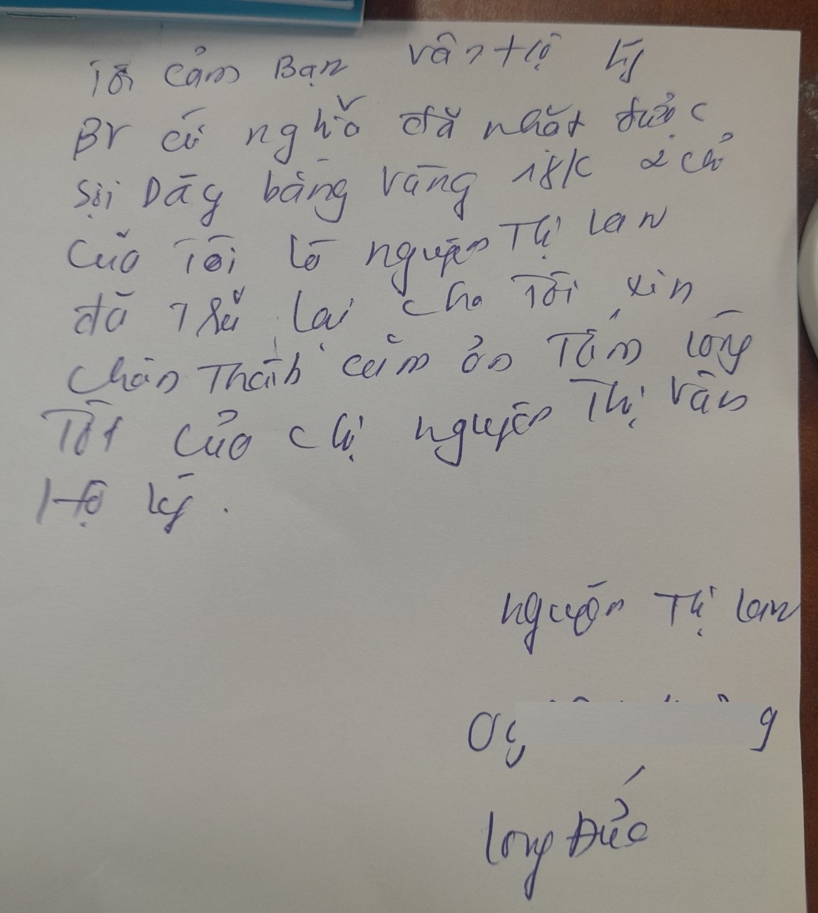 Khách hàng xúc động và gửi lời cám ơn chân thành đến nhân viên Hộ lý Nguyễn Thị Vân và PKĐK Ái Nghĩa Long Thành khi nhặt được tài sản và trao trả sợi dây chuyền 2 chỉ vàng 18K cho chủ nhân.