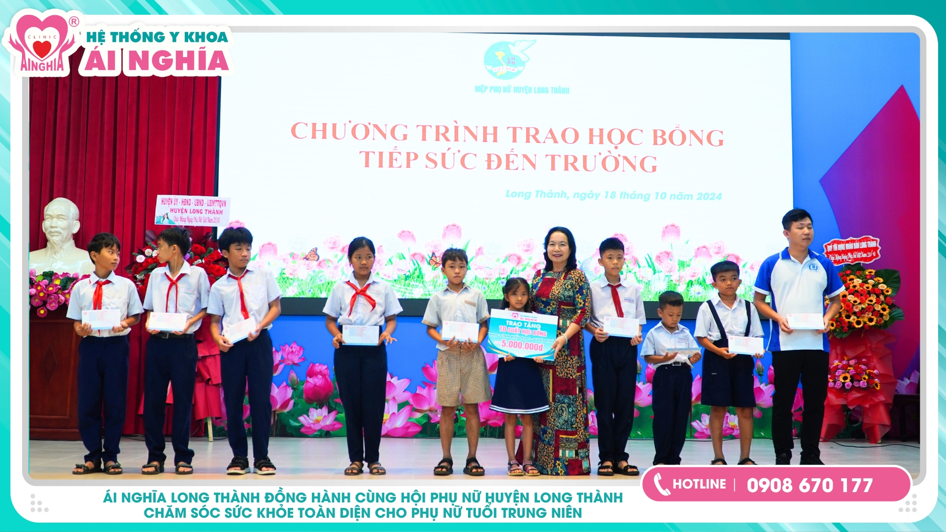Thông qua chương trình là cầu nối Hệ thống Y khoa Ái Nghĩa cũng đồng hành và trao tặng 40 phần quà cho các bộ phụ nữ có hoàn cảnh khó khăn, và 20 suất học bổng đến học sinh nghèo vượt khó trên địa bàn.