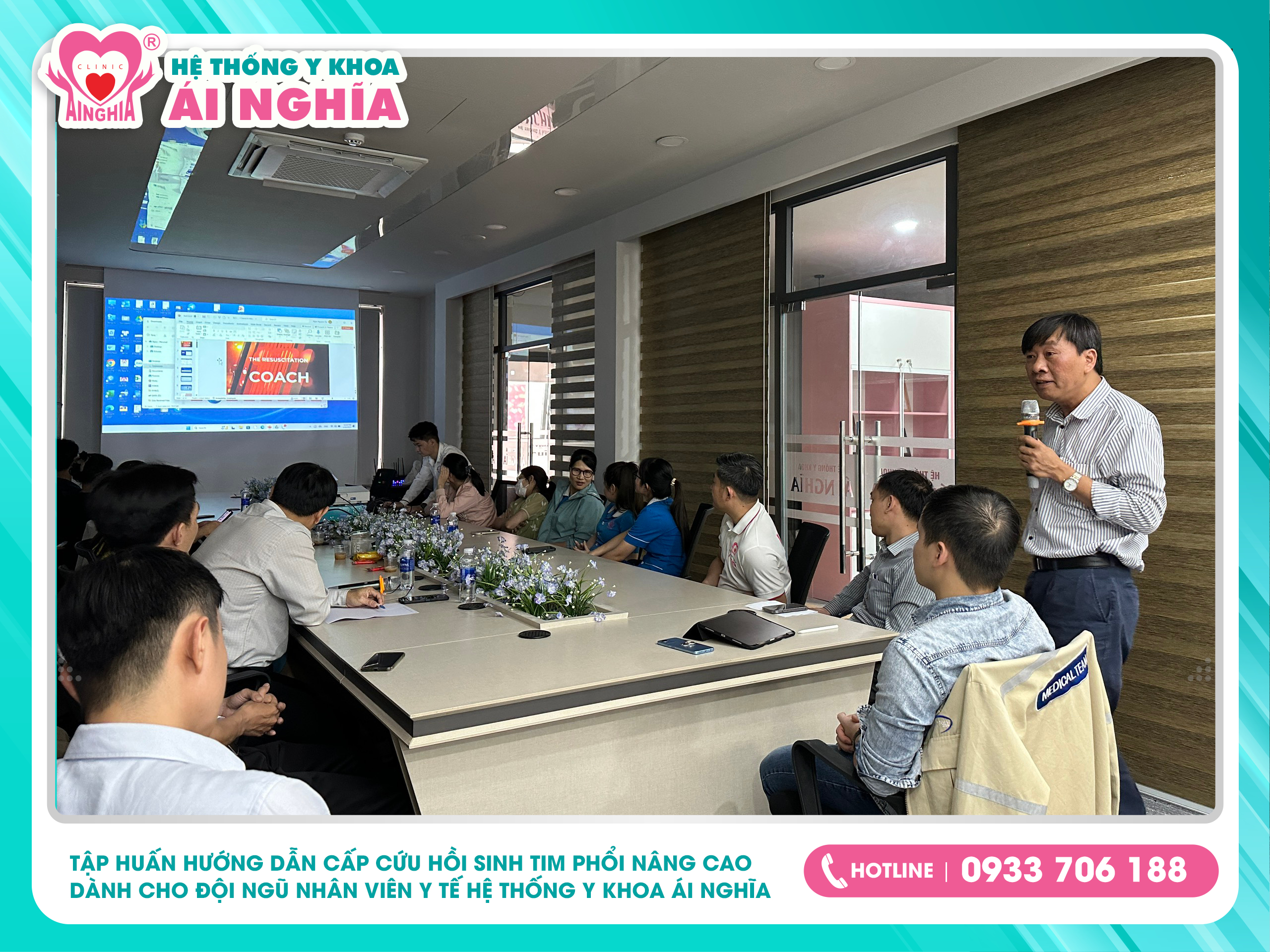 Tranh thủ giờ trưa nghỉ ngơi ngắn ngủi, đội ngũ NVYT đội Cấp cứu tại các chi nhánh PKĐK Ái Nghĩa luôn tận dụng để đào tạo và nâng cao, cập nhật kiến thức. Buổi đào tạo do ThS BS Nguyễn Đình Trí - Phó Tổng giám đốc chuyên đào tạo, nằm trong chuỗi chương trình Đào tạo tập huấn hồi sức tim phổi nâng cao (ACLS) thực hiện tất cả chi nhánh phòng khám.