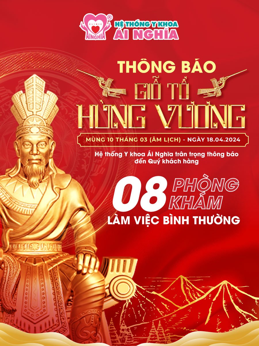 Hệ thống Y khoa Ái Nghĩa trân trọng thông báo lịch nghỉ lễ dịp lễ Giổ Tổ Hùng Vương và Giải phóng Miền nam & Quốc tế lao động cụ thể như sau:
