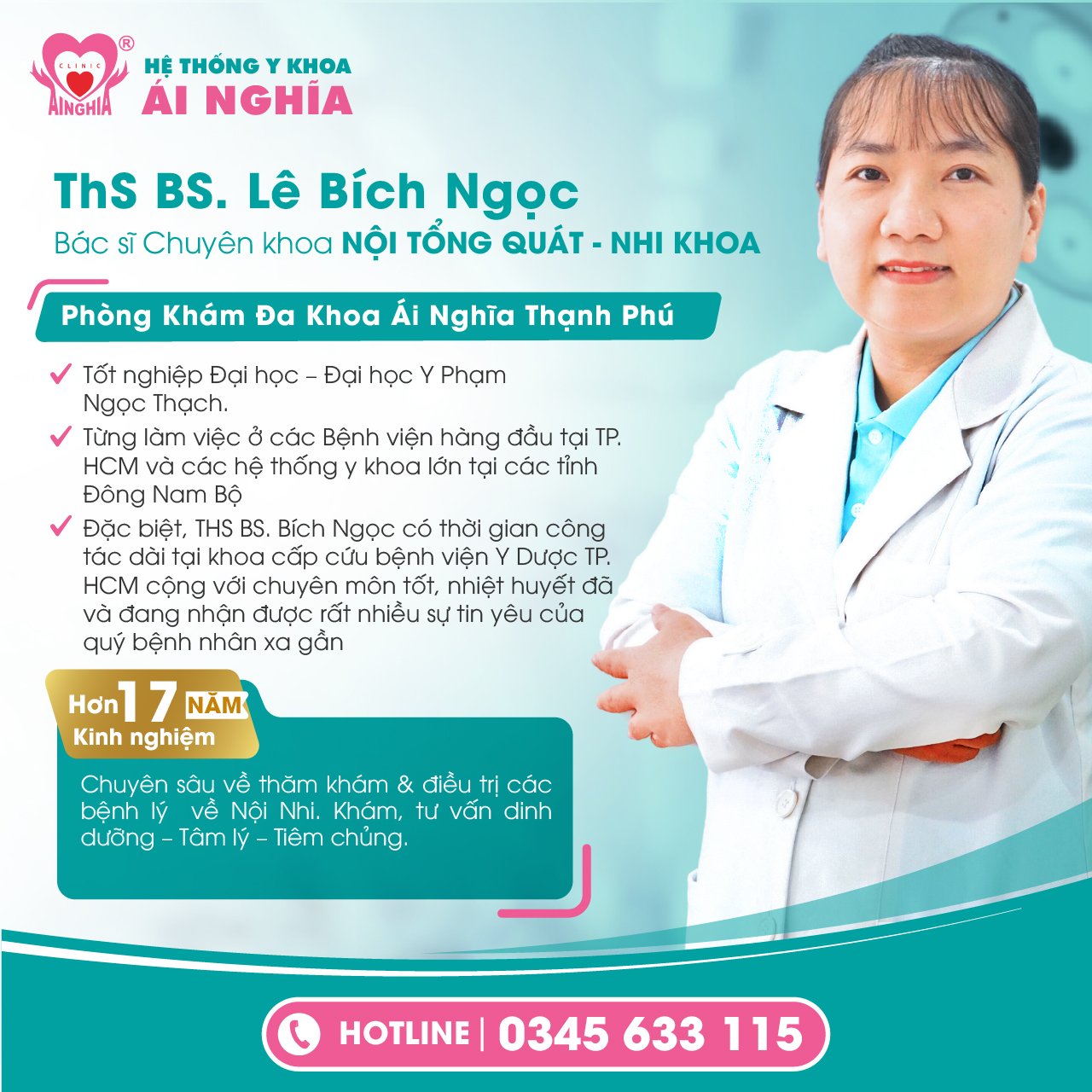 Đồng hành cùng phụ huynh trong việc Tư vấn bệnh lý, chế độ dinh dưỡng, vận động, và tình trạng dậy thì sớm ở trẻ và Chủ động phòng ngừa, phát hiện tình trạng thiếu máu ở trẻ. Phòng khám Đa khoa Ái Nghĩa Thạnh Phú thực hiện chương trình MIỄN PHÍ KHÁM, TƯ VẤN DINH DƯỠNG VÀ TẦM SOÁT THIẾU MÁU Ở TRẺ cùng ThS Bác sĩ Lê Bích Ngọc - Bác sĩ chuyên khoa Nội -Nhi cụ thể như sau: