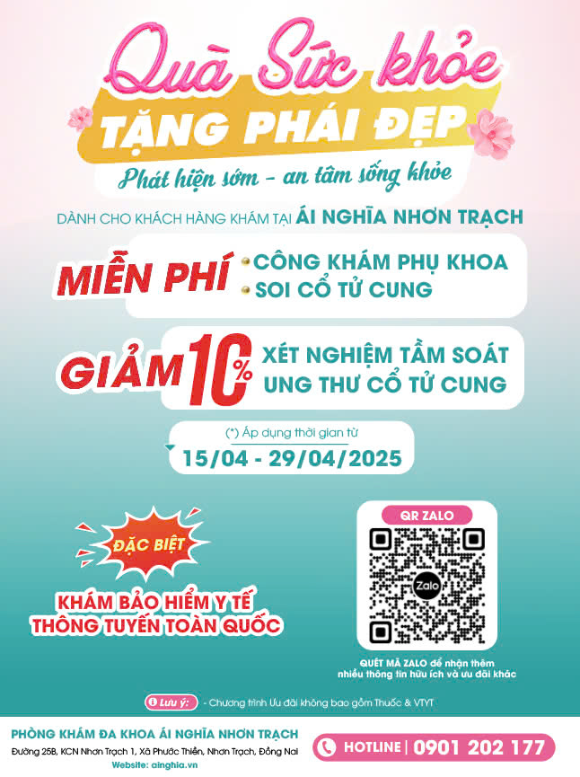 Phòng khám Đa khoa Ái Nghĩa Nhơn Trạch mang đến chương trình ưu đãi đặc biệt dành riêng cho phái đẹp – một món quà thiết thực và đầy yêu thương: