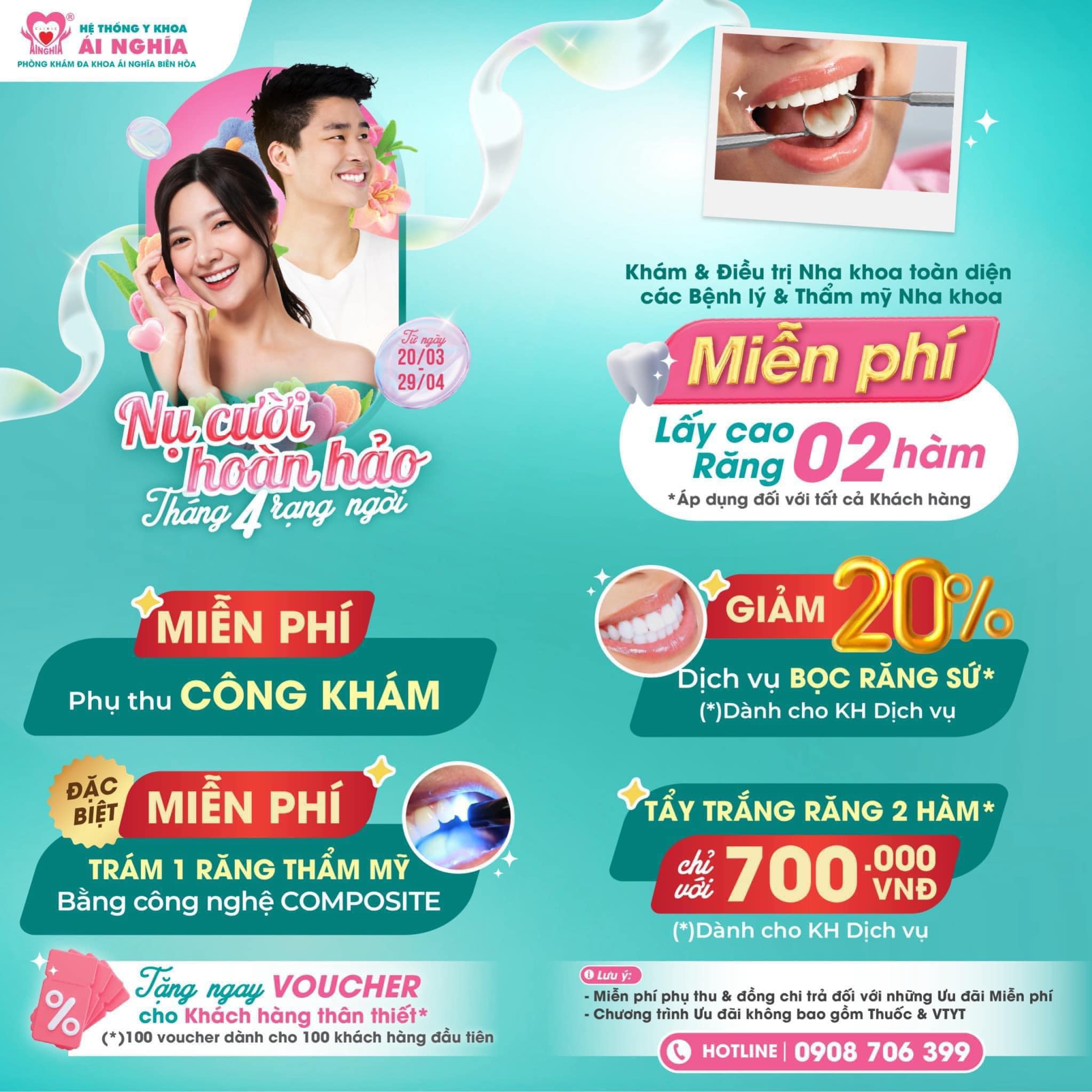 Đến với Nha Khoa PKĐK Ái Nghĩa Biên Hoà, Quý khách hàng đã quá yên tâm về chất lượng, giá dịch vụ và trang thiết bị hiện đại. Xin gửi đến quý khách hàng Nội dung ưu đãi Nha khoa cụ thể như sau: